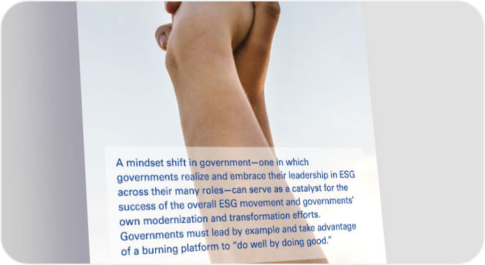 Shifting the mindset, reaping the benefits We have a unique opportunity to improve our defense capabilities and become a more efficient force, while securing a better future. I challenge our Army to examine climate threats, prioritize resources, and take swift action. Christine E. Wormuth Secretary of the Army Department of the Army, Office of the Assistant Secretary of the Army for Installations, Energy and Environment. February 2022. United States Army Climate Strategy. Washington, DC Governments need to begin looking at their mission, • Economic and cost efficiency opportunities strategy, and operations through an ESG lens to better through sustainable sourcing, process efficiencies, understand their relevant risks, vulnerabilities, and energy efficiency and renewable energy sourcing, opportunities. In our work, we see governments doing talent attraction and retention, and other financial arrangements related to ESG. ESG also can just that to achieve greater organizational stability, contribute to creating jobs and attracting businesses, better risk management, and increased resiliency— driving economic and regional development particularly in infrastructure-intensive and defense agencies. • Increased strategic alignment by integrating ESG goals with the agency‘s mission, including ongoing In shifting its mindset to leading by example on ESG in A mindset shift in government—one in which review of requirements, metrics, and targets all its roles, government can harness the power of ESG to move toward a Modern Government, one that governments realize and embrace their leadership in ESG • Improved public trust and confidence by taking is connected, powered, and trusted. ESG agendas can disciplined action around issues critical to the public‘s help attract the next-generation workforce connected across their many roles—can serve as a catalyst for the well-being and from the ability to withstand increased to purpose and mission, accelerate governments' scrutiny from major stakeholders and outside groups efforts to modernize across stakeholder groups, drive success of the overall ESG movement and governments’ innovation, and improve public trust in governments. • Stronger organizational resilience from improvedown modernization and transformation efforts. skills and alignment central to ESG that help agencies In particular, these five benefits stand out among adapt to an increasingly uncertain future. others when governments embed ESG in their Governments must lead by example and take advantage missions and operations:of a burning platform to “do well by doing good.” • Enhanced operations by incorporating business transformation, redesigned business systems, improved data transparency, or new assets that can help mitigate ESG risks and support the agency’s mission 15 Environmental, Social, and Governance: Government leadership as a catalyst for successEnvironmental, Social, and Governance: Government leadership as a catalyst for success 16 © 2022 KPMG LLP, a Delaware limited liability partnership and a member firm of the KPMG global organization of independent member © 2022 KPMG LLP, a Delaware limited liability partnership and a member firm of the KPMG global organization of independent firms affiliated with KPMG International Limited, a private English company limited by guarantee. All rights reserved.member firms affiliated with KPMG International Limited, a private English company limited by guarantee. All rights reserved.