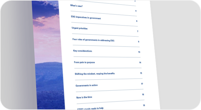 Defining ESG Content A legacy of leadership 3 What’s new? 4 ESG refers to a framework that integrates environmental, social, and governance risks and opportunities into an organization‘s strategy. The ESG imperatives in government 6 ESG movement has quickly evolved from socially responsible investing to a global imperative, affecting not only investment decisions and shareholders but also business strategy, the global economy, and Urgent priorities 7 people around the world. For governments, the goal is to build long-term sustainability and achieve desired outcomes for Four roles of governments in addressing ESG 9 constituents and other stakeholders. ESG includes a wide range of categories to assess the impact of a government agency‘s services and practices on the planet and society. Key considerations 13 ESG factors include: • Environmental criteria to examine how an From pain to purpose 14 agency performs as a steward of the natural environment • Social criteria to examine how an agency treats Shifting the mindset, reaping the benefits 15 people, including its employees and the communities in which it serves or operates • Governance criteria to examine how an agency Governments in action 17 holds itself accountable and is governed. Now is the time 18 KPMG stands ready to help 19 About the research 20 1Environmental, Social, and Governance: Government leadership as a catalyst for successEnvironmental, Social, and Governance: Government leadership as a catalyst for success2 © 2022 KPMG LLP, a Delaware limited liability partnership and a member firm of the KPMG global organization of independent © 2022 KPMG LLP, a Delaware limited liability partnership and a member firm of the KPMG global organization of independent member firms affiliated with KPMG International Limited, a private English company limited by guarantee. All rights reserved.member firms affiliated with KPMG International Limited, a private English company limited by guarantee. All rights reserved.