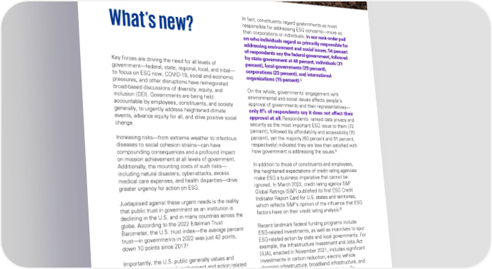 A legacy of leadership Governments have a long history of leading efforts to improve what we now call ESG issues—setting green In fact, constituents regard governments as most standards, defining supplier diversity programs to combat social injustice, and establishing supply chain responsible for addressing ESG concerns—more so reporting and metrics, among other achievements.What’s new? than corporations or individuals. In our rank-order poll on who individuals regard as primarily responsible for For more than 50 years, the federal government’s addressing environment and social issues, 54 percent immense purchasing power and role in procurement of respondents say the federal government, followed has created and accelerated new markets for by state government at 48 percent, individuals (31 sustainable products and services. When the goal is percent), local governments (29 percent), Key forces are driving the need for all levels of set to convert 600,000 vehicles to a 100 percent zero- corporations (23 percent), and international government—federal, state, regional, local, and tribal— 4 emission electric fleet—per the executive order organizations (15 percent). to focus on ESG now. COVID-19, social and economic issued by the White House in 2021—it sends a clear pressures, and other disruptions have reinvigorated 1 On the whole, governments' engagement with signal for market demand. broad-based discussions of diversity, equity, and environmental and social issues affects people’s inclusion (DEI). Governments are being held approval of governments and their representatives— accountable by employees, constituents, and society only 8% of respondents say it does not affect their generally, to urgently address heightened climate approval at all.Respondents ranked data privacy and events, advance equity for all, and drive positive social security as the most important ESG issue to them (72 change. percent), followed by affordability and accessibility (70 As the modern ESG percent), yet the majority (60 percent and 61 percent, Increasing risks—from extreme weather to infectious respectively) indicated they are less than satisfied with diseases to social cohesion strains—can have 5 movement evolves, how government is addressing the issues. compounding consequences and a profound impact on mission achievement at all levels of government. governments now have In addition to those of constituents and employees, Additionally, the mounting costs of such risks— the heightened expectations of credit rating agencies including natural disasters, cyber-attacks, excess an opportunity to build make ESG a business imperative that cannot be medical care expenses, and health disparities—drive ignored. In March 2022, credit rating agency S&P greater urgency for action on ESG. on a foundation of Global Ratings (S&P) published its first ESG Credit Indicator Report Card for U.S. states and territories, Juxtaposed against these urgent needs is the reality leadership and answer a which reflects S&P’s opinion of the influence that ESG that public trust in government as an institution is 6 factors have on their credit rating analysis. broader call, with an declining in the U.S. and in many countries across the globe. According to the 2022 Edelman Trust Recent landmark federal funding programs include Barometer, the U.S. trust index—the average percent observable shift in the ESG-related investments, as well as incentives to spur trust—in governments in 2022 was just 42 points, ESG-related action by state and local governments. For 2 down 10 points since 2017. way they have typically example, the Infrastructure Investment and Jobs Act (IIJA), enacted in November 2021, includes significant Importantly, the U.S. public generally values and led on ESG issues. investments in carbon reduction, electric vehicle expects governments’ involvement and action related charging infrastructure, broadband infrastructure, and to ESG issues—and wants governments to take more supply chains for clean energy technologies. To action. In February 2022, KPMG LLP (KPMG) position for competitive grant opportunities that are conducted a survey of the U.S. public to examine part of the program, state and local governments will individuals‘ sentiments on governments‘ approach to need to demonstrate that they will be good stewards ESG. While about 7 in 10 individuals indicate that of the funding from an ESG perspective. governments should play a leading role in solving environmental and social issues, only 35% agree or Governments have the opportunity to seize this strongly agree that the governments are taking the moment to reestablish their role with respect to 3 appropriate amount of action to solve these issues. driving gains on major ESG issues. 5 2 Ibid. 1 2022 Edelman Trust Barometer Fact Sheet: President Biden Signs Executive Order Catalyzing America’s Clean 3 6 KPMG survey among U.S. residents S&P Global, ESG Credit Indicator Energy Economy Through Federal Sustainability 4 Environmental, Social, and Governance: Environmental, Social, and Governance: Government Ibid. Report Card: US States And Territories 3Government leadership as a catalyst for success leadership as a catalyst for success 4 © 2022 KPMG LLP, a Delaware limited liability partnership and a member firm of the KPMG global organization of independent member © 2022 KPMG LLP, a Delaware limited liability partnership and a member firm of the KPMG global organization of independent firms affiliated with KPMG International Limited, a private English company limited by guarantee. All rights reserved.member firms affiliated with KPMG International Limited, a private English company limited by guarantee. All rights reserved.