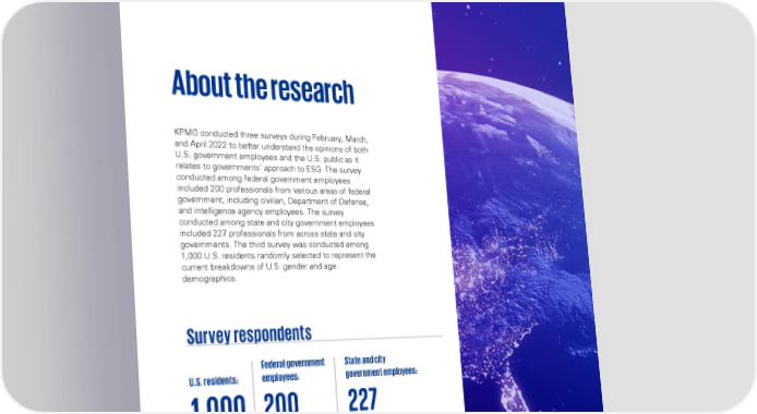 KPMG stands ready About the research to help KPMG conducted three surveys during February, March, and April 2022 to better understand the opinions of both U.S. government employees and the U.S. public as it We were one of the first firms in our profession to bring relates to governments' approach to ESG. The survey conducted among federal government employees ESG commitments under one umbrella, codified in our included 200 professionals from various areas of federal KPMG IMPACT plan. The document includes a road government, including civilian, Department of Defense, map to reduce our impact on the environment and and intelligence agency employees. The survey create an inclusive, caring, and values-led culture for our conducted among state and city government employees people. included 227 professionals from across state and city governments. The third survey was conducted among In addition to walking the talk ourselves, we have deep 1,000 U.S. residents randomly selected to represent the experience helping clients address critical ESG issues— current breakdowns of U.S. gender and age including decarbonization, strategic planning, reporting, demographics. asset and climate modeling, health equity, DEI, cybersecurity, and enterprise risk management. We can help create the right blueprint to integrate ESG into your mission and operations. We can help simplify your strategy and guide its full implementation so that you can take the lead on ESG. Survey respondents With more than 100 years of experience serving Federal government State and city governments, we have a deep understanding of capital- intensive, complex infrastructure, and data-driven U.S. residents:employees:government employees: technology, and bring a complete suite of tailored methodologies, tools, and accelerators. Leveraging an approach that is both holistic and practical, we go 1,000 200227 beyond strategy, working side by side with you at each step of your ESG journey. We work hard to make your goal our goal: creating positive change that benefits government workers, constituents, and communities. That is, a government that is connected, powered, and trusted. Environmental, Social, and Governance: Government leadership as a catalyst for success 20 Environmental, Social, and Governance: Government leadership as a catalyst for success 19 © 2022 KPMG LLP, a Delaware limited liability partnership and a member firm of the KPMG global organization of independent member © 2022 KPMG LLP, a Delaware limited liability partnership and a member firm of the KPMG global organization of independent firms affiliated with KPMG International Limited, a private English company limited by guarantee. All rights reserved.member firms affiliated with KPMG International Limited, a private English company limited by guarantee. All rights reserved.