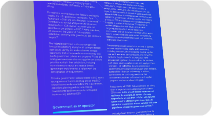 Government as a policy maker electrifying their fleet vehicles, and enhancing privacy and cybersecurity, among many other operational Policy making is a central role of governments, strategies that may directly or indirectly advance ESG creating guiding principles and courses of action for objectives. governments. Governments are now enacting policies that advance action on ESG-related issues, including Governments are among the largest owners and Four roles of governments in establishing ESG commitments and targets, creating operators of infrastructure assets—from military task forces and interagency working groups to bases, roads, bridges, ports, and transit systems to examine and address ESG issues, and other policy energy, public health, and education infrastructure, and addressing ESG issuesefforts. more. As approximately 70 percent of global greenhouse gas emissions come from infrastructure construction and For example, among many other federal sustainability operations, governments will likely consider incorporating In their work to address ESG issues, governments have four distinct roles. While targets, the U.S. government rejoined the Paris a focus on ESG and resilience into capital planning and 13 governments’ work on ESG issues as a regulator and policy maker is perhaps the most Agreement in 2021 and set a Nationally Determined investing in resilient infrastructure. Investment in well known, governments at all levels are making significant changes to their roles as Contribution to achieve a 50 percent to 52 percent resilient infrastructure also plays a critical role in an operator and employer in light of ESG priorities.reduction from 2005 levels in economy-wide net mitigating the impacts of natural disasters on 10 greenhouse gas pollution in 2030. At the state level, communities and will likely be considered with an equity 24 states and the District of Columbia have lens to protect vulnerable communities susceptible to established economy-wide greenhouse gas emissions disproportionate impacts in their social, built, economic, 11 targets. and natural environments. Government as a regulator The federal government is also pursuing policies Governments procure products that are vital to defense, focused on advancing equity for all, calling on federal national security, health, equity, and the economy, agencies to identify and address barriers to equal including weaponry, pharmaceuticals, medical supplies, legislation mandating divestment of public assets from opportunity that underserved communities may face rare earth elements, semiconductors, and many other 12 fossil fuels, requiring the state, including its $17 billion Governments drive action on ESG through regulatory due to government policies and programs. State and products. Supply chains for such products have change. Governments have long enacted and upheld pension fund and state treasury, to divest itself of local governments are also making policy decisions to experienced significant disruptions from the pandemic, regulations addressing issues across the E, S, and G, assets invested in the fossil fuel industry by January 1, prioritize equity in their jurisdictions, including port crises, severe weather events, and supply and labor 8 including different antipollution, resource-use, 2026. commitments to recruit and retain a diverse shortages—all highlighting the vital importance of antidiscrimination, privacy, and labor regulations, government workforce that is reflective of the governments investing in building supply chain resilience, States are also beginning to consider legislation to among others. demographics of the jurisdiction. sustainability, diversity, and security. In addition, create more climate transparency and accountability governments are continuing to examine their Public awareness, social pressures, investor demands, from major corporations. For example, the California Critically, governments’ policies related to ESG issues procurement practices and contractor and supplier Climate Corporate Accountability Act, being and the priorities and directives of government officials spur government action and help ensure that ESG- programs to advance related ESG goals. and legislative bodies are expanding regulatory considered by the California Assembly as of June related issues are key considerations in government boundaries as they relate to addressing ESG as a 2022, would be a first-of-its-kind legislation to require operations planning and decision-making. Respondents tell KPMG that governments are falling annual reporting of greenhouse gas emissions by both whole. In March 2022, for example, the Securities and Governments lead by example by setting and short of expectations in addressing many of these Exchange Commission released proposed rules, The public and private companies doing business in implementing policy on ESG. ESG issues. In the area of disaster response and Enhancement and Standardization of Climate-Related California and generating over $1 billion in gross annual resilience, for example, 56 percent of survey 9 Disclosures for Investors, that would require revenue. respondents are less than satisfied with how the registrants to provide certain climate-related government is addressing this issue. Some 60 information, including disclosure of greenhouse gas ESG-related proposals and regulations continue to Government as an operator percent of respondents are not satisfied with their 14 emissions, in their registration statements and annual generate strong responses from state and local experience of receiving government services. reports. The proposed rules are expansive and governments. For example, in many states, lawmakers are introducing legislation and practices which push intended to provide more consistent, comparable, and With significant footprints, governments have the back on financial institutions that are divesting from decision-useful information so that investors can better