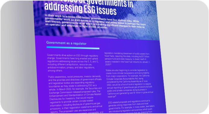 Government as a policy maker electrifying their fleet vehicles, and enhancing privacy and cybersecurity, among many other operational Policy making is a central role of governments, strategies that may directly or indirectly advance ESG creating guiding principles and courses of action for objectives. governments. Governments are now enacting policies that advance action on ESG-related issues, including Governments are among the largest owners and Four roles of governments in establishing ESG commitments and targets, creating operators of infrastructure assets—from military task forces and interagency working groups to bases, roads, bridges, ports, and transit systems to examine and address ESG issues, and other policy energy, public health, and education infrastructure, and addressing ESG issues efforts. more. As approximately 70 percent of global greenhouse gas emissions come from infrastructure construction and For example, among many other federal sustainability operations, governments will likely consider incorporating In their work to address ESG issues, governments have four distinct roles. While targets, the U.S. government rejoined the Paris a focus on ESG and resilience into capital planning and 13 governments’ work on ESG issues as a regulator and policy maker is perhaps the most Agreement in 2021 and set a Nationally Determined investing in resilient infrastructure. Investment in well known, governments at all levels are making significant changes to their roles as Contribution to achieve a 50 percent to 52 percent resilient infrastructure also plays a critical role in an operator and employer in light of ESG priorities. reduction from 2005 levels in economy-wide net mitigating the impacts of natural disasters on 10 greenhouse gas pollution in 2030. At the state level, communities and will likely be considered with an equity 24 states and the District of Columbia have lens to protect vulnerable communities susceptible to established economy-wide greenhouse gas emissions disproportionate impacts in their social, built, economic, 11 targets. and natural environments. Government as a regulator The federal government is also pursuing policies Governments procure products that are vital to defense, focused on advancing equity for all, calling on federal national security, health, equity, and the economy, agencies to identify and address barriers to equal including weaponry, pharmaceuticals, medical supplies, legislation mandating divestment of public assets from opportunity that underserved communities may face rare earth elements, semiconductors, and many other 12 fossil fuels, requiring the state, including its $17 billion Governments drive action on ESG through regulatory due to government policies and programs. State and products. Supply chains for such products have change. Governments have long enacted and upheld pension fund and state treasury, to divest itself of local governments are also making policy decisions to experienced significant disruptions from the pandemic, regulations addressing issues across the E, S, and G, assets invested in the fossil fuel industry by January 1, prioritize equity in their jurisdictions, including port crises, severe weather events, and supply and labor 8 including different antipollution, resource-use, 2026. commitments to recruit and retain a diverse shortages—all highlighting the vital importance of antidiscrimination, privacy, and labor regulations, government workforce that is reflective of the governments investing in building supply chain resilience, States are also beginning to consider legislation to among others. demographics of the jurisdiction. sustainability, diversity, and security. In addition, create more climate transparency and accountability governments are continuing to examine their Public awareness, social pressures, investor demands, from major corporations. For example, the California Critically, governments’ policies related to ESG issues procurement practices and contractor and supplier Climate Corporate Accountability Act, being and the priorities and directives of government officials spur government action and help ensure that ESG- programs to advance related ESG goals. and legislative bodies are expanding regulatory considered by the California Assembly as of June related issues are key considerations in government boundaries as they relate to addressing ESG as a 2022, would be a first-of-its-kind legislation to require operations planning and decision-making. Respondents tell KPMG that governments are falling annual reporting of greenhouse gas emissions by both whole. In March 2022, for example, the Securities and Governments lead by example by setting and short of expectations in addressing many of these Exchange Commission released proposed rules, The public and private companies doing business in implementing policy on ESG. ESG issues. In the area of disaster response and Enhancement and Standardization of Climate-Related California and generating over $1 billion in gross annual resilience, for example, 56 percent of survey 9 Disclosures for Investors, that would require revenue. respondents are less than satisfied with how the registrants to provide certain climate-related government is addressing this issue. Some 60 information, including disclosure of greenhouse gas ESG-related proposals and regulations continue to Government as an operator percent of respondents are not satisfied with their 14 emissions, in their registration statements and annual generate strong responses from state and local experience of receiving government services. reports. The proposed rules are expansive and governments. For example, in many states, lawmakers are introducing legislation and practices which push intended to provide more consistent, comparable, and With significant footprints, governments have the back on financial institutions that are divesting from decision-useful information so that investors can bett
