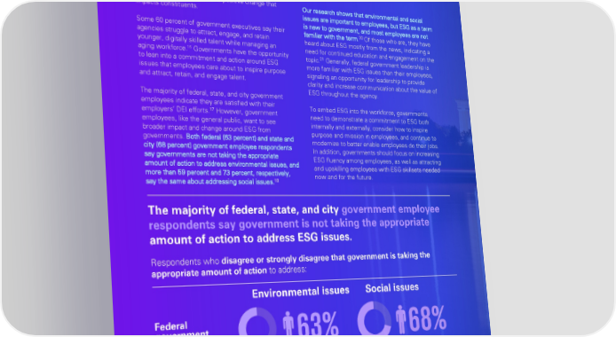 Government as an employer Data privacy and security is the most important ESG issue for federal employee survey respondents (88 Government is the largest U.S. employer, so its percent), followed closely by infrastructure 15 human capital footprint is vast. Protecting the health modernization (76 percent). State and city employees and well-being of government employees and report infrastructure modernization as the top issue improving DEI in the government workforce not only (86 percent), followed by data privacy and security (83 benefits employees, but also creates a better 19 percent). opportunity for employees to advance their agency’s mission and ultimately, create positive change that Our research shows that environmental and social impacts constituents. issues are important to employees, but ESG as a term is new to government, and most employees are not Some 60 percent of government executives say their 20 familiar with the term. Of those who are, they have agencies struggle to attract, engage, and retain heard about ESG mostly from the news, indicating a younger, digitally skilled talent while managing an need for continued education and engagement on the 16 aging workforce. Governments have the opportunity 21 topic. Generally, federal government leadership is to lean into a commitment and action around ESG more familiar with ESG issues than their employees, issues that employees care about to inspire purpose signaling an opportunity for leadership to provide and attract, retain, and engage talent. clarity and increase communication about the value of ESG throughout the agency. The majority of federal, state, and city government employees indicate they are satisfied with their To embed ESG into the workforce, governments 17 employers’ DEI efforts. However, government need to demonstrate a commitment to ESG both employees, like the general public, want to see internally and externally, consider how to inspire broader impact and change around ESG from purpose and mission in employees, and continue to governments. Both federal (63 percent) and state and modernize to better enable employees do their jobs. city (68 percent) government employee respondents In addition, governments should focus on increasing say governments are not taking the appropriate ESG fluency among employees, as well as attracting amount of action to address environmental issues, and and upskilling employees with ESG skillsets needed more than 59 percent and 73 percent, respectively, now and for the future. 18 say the same about addressing social issues. The majority of federal, state, and city go vernment employee respondents say government is not taking the appropriate amount of action to address ESG issues. Respondents who disagree or strongly disagree that government is taking the appropriate amount of action to address: Environmental issues Social issues Federal government 63% 68% employees State and city government employees 59% 73% Source: KPMGsurvey among U.S federal, state, and city HPWFSO N FO U employees, n=427 18 15 21 U.S. Office of Personnel Management website Ibid. Ibid. 19 16 KPMG Modern Government survey, 2021 Ibid. 20 17 KPMG survey among U.S federal, state, and city government employees Ibid. Environmental, Social, and Governance: Government leadership as a catalyst for success Environmental, Social, and Governance: Government leadership as a catalyst for success 12 11 © 2022 KPMG LLP, a Delaware limited liability partnership and a member firm of the KPMG global organization of independent member © 2022 KPMG LLP, a Delaware limited liability partnership and a member firm of the KPMG global organization of independent firms affiliated with KPMG International Limited, a private English company limited by guarantee. All rights reserved. member firms affiliated with KPMG International Limited, a private English company limited by guarantee. All rights reserved.