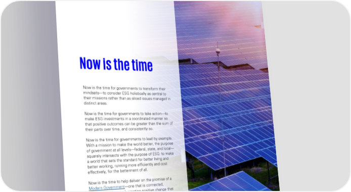 Governments Morehouse School of Medicine Morehouse School of Medicine (Morehouse) won a grant from the U.S. Department of Health and Human in actionServices, Office of Minority Health, to address COVID-19 in racial and ethnic minority, rural, and Federal, state, and local government agencies that socially vulnerable communities. Morehouse took into place a strategic focus on ESG can produce tangible account infrastructure and regulatory requirements impacts on operations, finances, and organizational along with the additional complexities of a siloed resilience. workforce; the complex health needs of the communities characterized by mental health Here are a few examples: challenges, co-morbidities, and other social determinants of health (SDOH); disparities in SDOH U.S. Army and healthcare access that pose unique challenges to disseminating an effective mitigation strategy; and The U.S. Army broke new ground in February 2022 linguistic barriers that often alienate under-served when it released its first-ever Army Climate Strategy populations. (ACS). The strategy is designed to help counter the threat climate change poses to the Army’s ability to Morehouse developed a platform that gathers critical provide trained and ready forces in response to national resources and data on COVID-19 to connect families to security threats around the world. The ACS includes culturally and linguistically appropriate information and aggressive goals to reduce Army net greenhouse gas services. The platform enables communication and Now is the time pollution, attain net-zero Army greenhouse gas information dissemination, linking the country’s most emissions, and electrify all non-combat vehicles, among vulnerable populations to the right care at the right other objectives. time. In aiming to decrease overall infection and death Now is the time for governments to transform their rates, Morehouse demonstrates the major return on The ACS aims not only to secure a sustainable, cleaner mindsets—to consider ESG holistically as central to investment that can be achieved by addressing health tomorrow but also to save soldiers’ lives. In combat, for their missions rather than as siloed issues managed in inequity and access. example, the supply lines that provide fuel for forward distinct areas. operating bases, Humvees, and other fighting vehicles are major targets for attack. Taking fossil fuels out of City of Los Angeles Now is the time for governments to take action—to the equation—or even just improving the fuel efficiency make ESG investments in a coordinated manner so of tanks and other heavy vehicles—can potentially help that positive outcomes can be greater than the sum of Aiming to “lead the automotive revolution of the mitigate that threat. their parts over time, and consistently so. future,” the City of Los Angeles approved an “Electric New York Power Authority Vehicle Master Plan” in April 2022. The plan outlines Now is the time for governments to lead by example. an entirely electric fleet of more than 10,000 City- With a mission to make the world better, the purpose owned vehicles and deployment of an electric vehicle New York Power Authority (NYPA) is embedding ESG of government at all levels—federal, state, and local— (EV) charging infrastructure across the City. The as a foundational pillar of its 10-year strategic plan. The squarely intersects with the purpose of ESG: to make initiative is part of its effort to be one of the first U.S. plan addresses 15 material ESG areas, from a world that sets the standard for better living and cities to rely on carbon-free energy by 2035. decarbonization and energy reliability, to affordability better working, running more efficiently and cost and accessibility, employee health and safety, the effectively, for the betterment of all. The City is focused on equitable placement of EV environmental and social impacts of its supply chain, infrastructure across Los Angeles, leveraging state and and enterprise risk and resilience. Central to its strategy Now is the time to help deliver on the promise of a federal funding—including historic investments in the is the reporting and disclosure of comprehensive data Modern Government—one that is connected, EV sector in the 2021 Infrastructure Investment and related to the implementation of ESG goals. NYPA aims powered, and trusted, creating positive change that Jobs Act—for the mass adoption of EVs. to become among the first U.S. utilities and benefits government workers, constituents, and government entities to issue an integrated report for the communities. 2022 reporting cycle. Sources: Department of the Army, Office of the Assistant Secretary of the Army for Installations, Energy and Environment. February 2022. United States Army Climate Strategy. Washington, DC. New York Power Authority 2021-2025 Sustainability Plan Morehouse School of Medicine National COVID-19 Resiliency Network website City of Los Angeles Electric Vehicle Master Plan Environmental, Social, and Governance: 17 Environmental, Social, and Governance: Government leadership as a catalyst for success Government leadership as a catalyst for success 18 © 2022 KPMG LLP, a Delaware limited liability partnership and a member firm of the KPMG global organization of independent member © 2022 KPMG LLP, a Delaware limited liability partnership and a member firm of the KPMG global organization of independent firms affiliated with KPMG International Limited, a private English company limited by guarantee. All rights reserved.member firms affiliated with KPMG International Limited, a private English company limited by guarantee. All rights reserved.